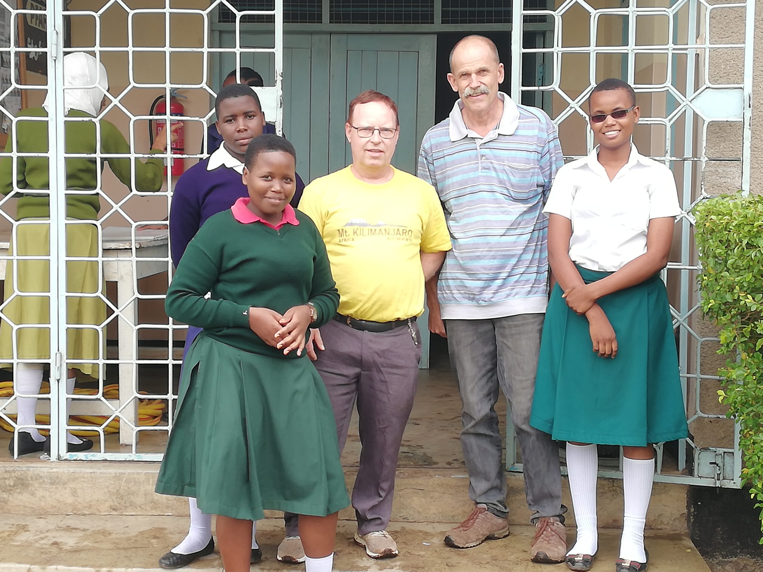 Der Schulleiter des Hai-Vocational-Training-Centers Rainer Kammleiter und der erste Vorsitzende Dietmar Peitzmeier zusammen mit drei Teilnehmerinnen des Nähkurses.